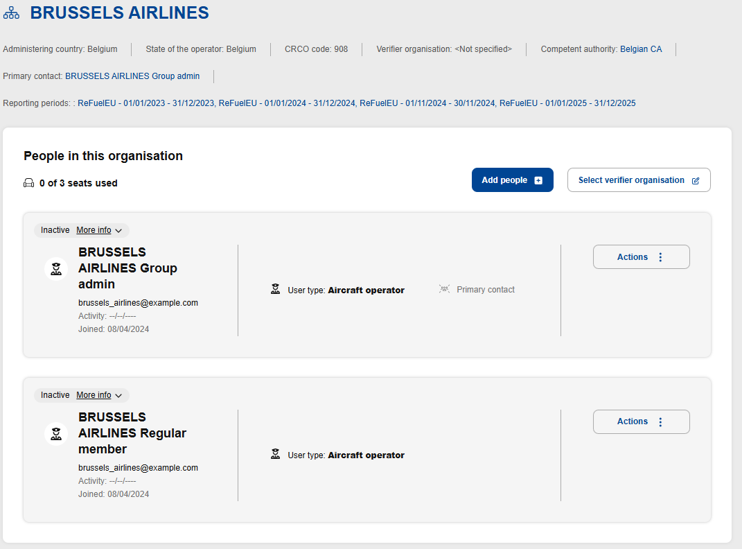 This action allows the transfer of the “primary contact” flag from one organization member to another. Only a competent authority administrator can perform this operation for aircraft operators. Transferring the primary contact of a competent authority organization can be achieved by administrators of the competent authority.