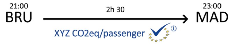 The secondary label display is for the footprint (in kgCO2e per passenger or freight tonne), efficiency (in gCO2e per passenger kilometer or freight-tonne-kilometer), and fuel lifecycle emissions (gCO2e/MJ) for the selected by the passenger cabin or cargo alongside the relevant benchmark.